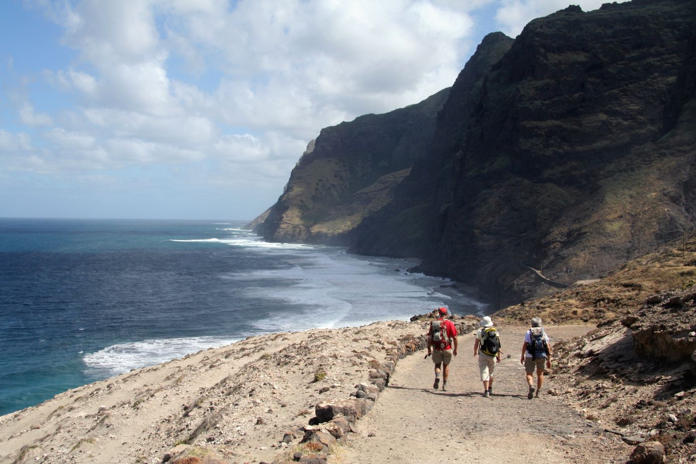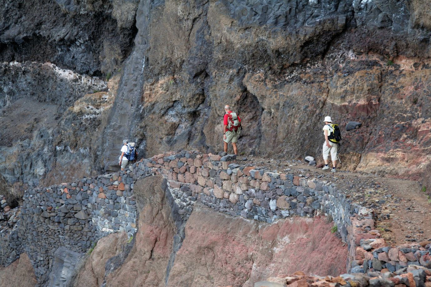 Un chemin pavé entre mer et montagne nous conduit dans la vallée de Ribeira Alta d’où une grande montée en lacets permet de passer les derniers contreforts qui séparent ces vallées reculées des voies de communication. Descente et passage en bord de mer sur un étroit cordon de galets coincé entre falaise et océan pour rejoindre le coquet village fleuri de Chã de Igreja où trône une église avec sa petite place conviviale. Installation une nuit à Chã d’Igreja.