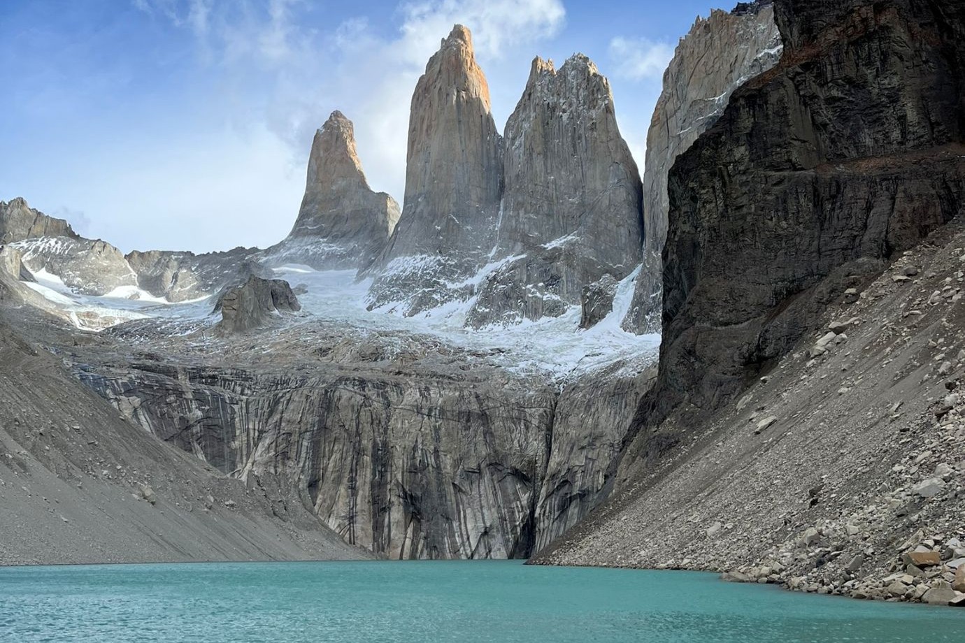 Randonnée jusqu’aux fameuses Torres del Paine, ces trois grandes tours devenues l’emblème du parc. La première étape nous mènera jusqu’au refuge Chileno en moins de deux heures. Nous suivrons ensuite un petit sentier forestier le long d’une rivière, pour atteindre le camp Torres en 1h30. Enfin, il nous faudra prendre un sentier raide entre de gros blocs rocheux pendant une quarantaine de minutes pour pouvoir admirer les trois tours et leur lac turquoise. Cette vue ne se dévoile qu’au dernier moment. Redescente par le même chemin puis trajet retour jusqu’à Puerto Natales.