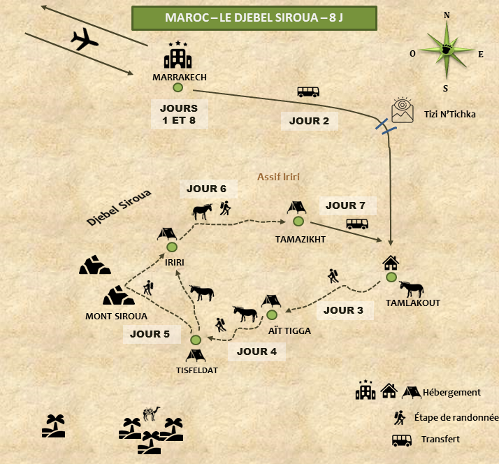 Pour marcheurs moyens pratiquant déjà la randonnée, étapes de 5h minimum à 6h, sur sentiers ou pistes. Très beau paysage de contraste entre dunes, oasis et villages perdus.
