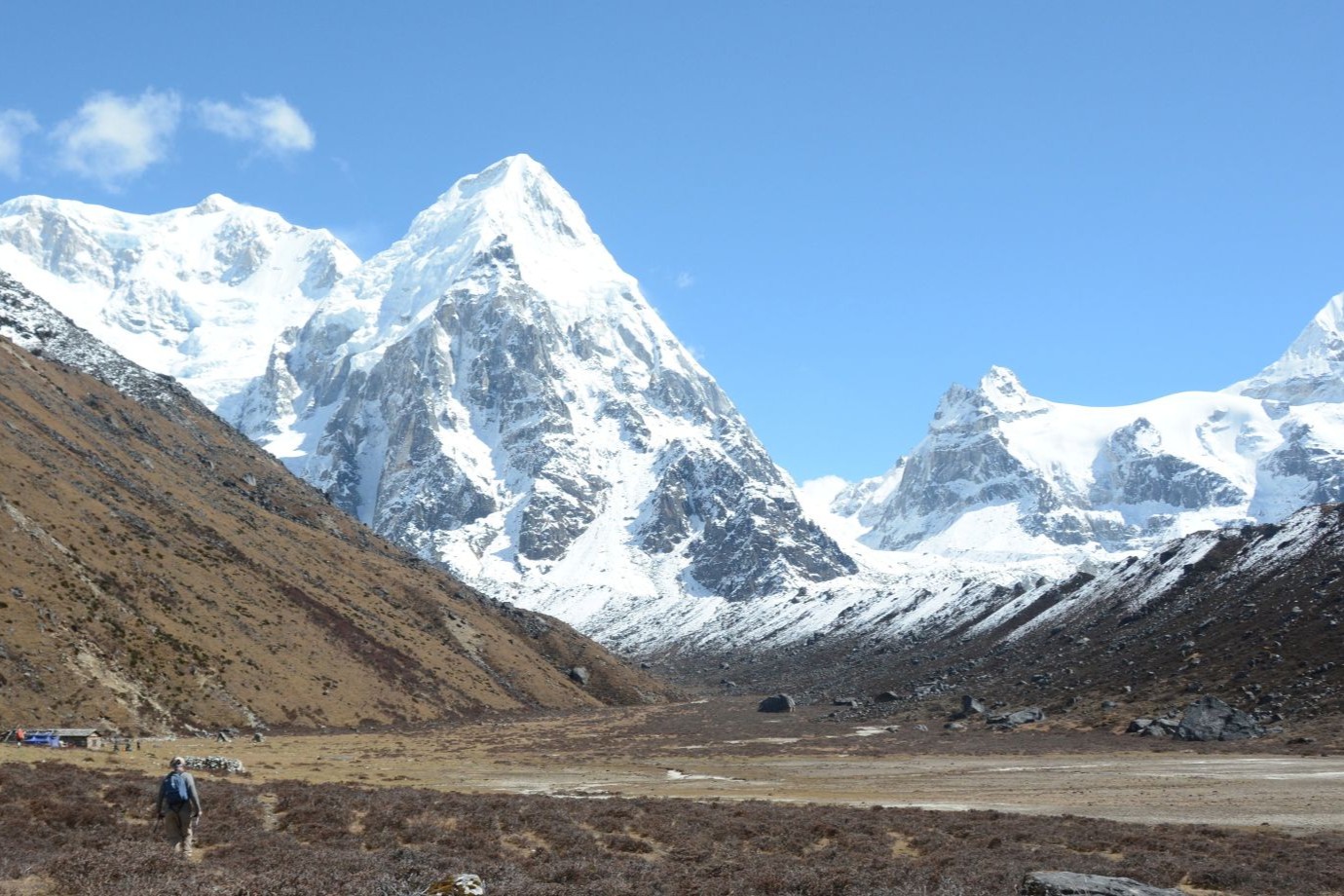 Une courte randonnée nous mène à Pang Pema, qui peut servir de camp de base pour l’ascension du Kangchenjunga. Le sentier de Lhonak à Pang Pema monte progressivement à travers la plaine, puis se raidit en longeant la moraine. Pang Pema, ou camp de base du Kangchenjunga (5143 m), est le point culminant de ce trek. Une courte marche nous conduit à une crête offrant un superbe panorama sur le Kangchenjunga, le Wedge Peak, les Twins Peak, le Tent Peak et d’autres sommets. Nous rebroussons ensuite chemin vers Pang Pema, puis poursuivons notre route vers Lhonak.