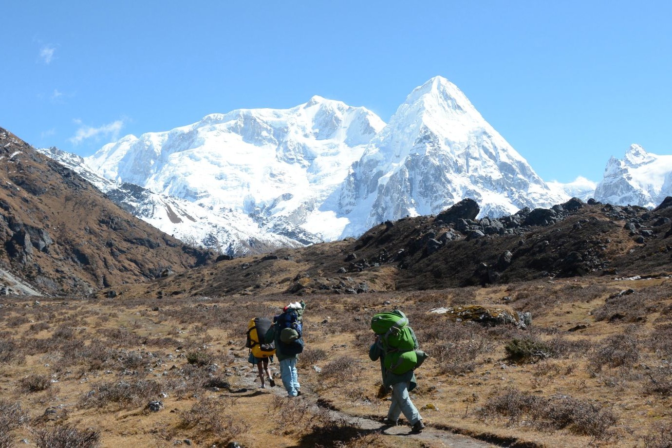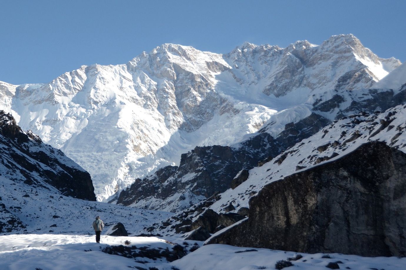 Explorer Oktang (4730 m) / Ramche. Tôt le matin, nous emportons avec nous, notre déjeuner pour cette notre première rencontre avec le Kanchenjunga. Les trois sommets principaux du Mt Kanchenjunga (8420 m), à (8586 m) et (8474 m), sont tous proches juste devant nous…. Plus loin vers Oktang (4730 m), nous pouvons alors descendre sur le glacier.