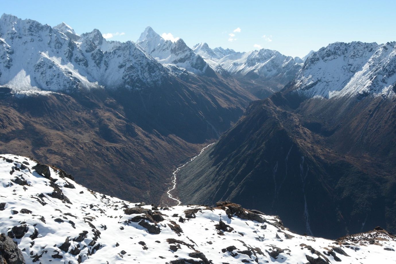 Journée difficile, avec le passage de trois cols, avec des panoramas spectaculaires sur les sommets environnants. Outre le majestueux sommet du Jannu, nous apercevons le Makalu, l’Everest, le Gyakung Kang, le Lhotse et le Chamalang. Au sud, la vue s’étend jusqu’au Teraï, un panorama qui récompense largement notre effort.