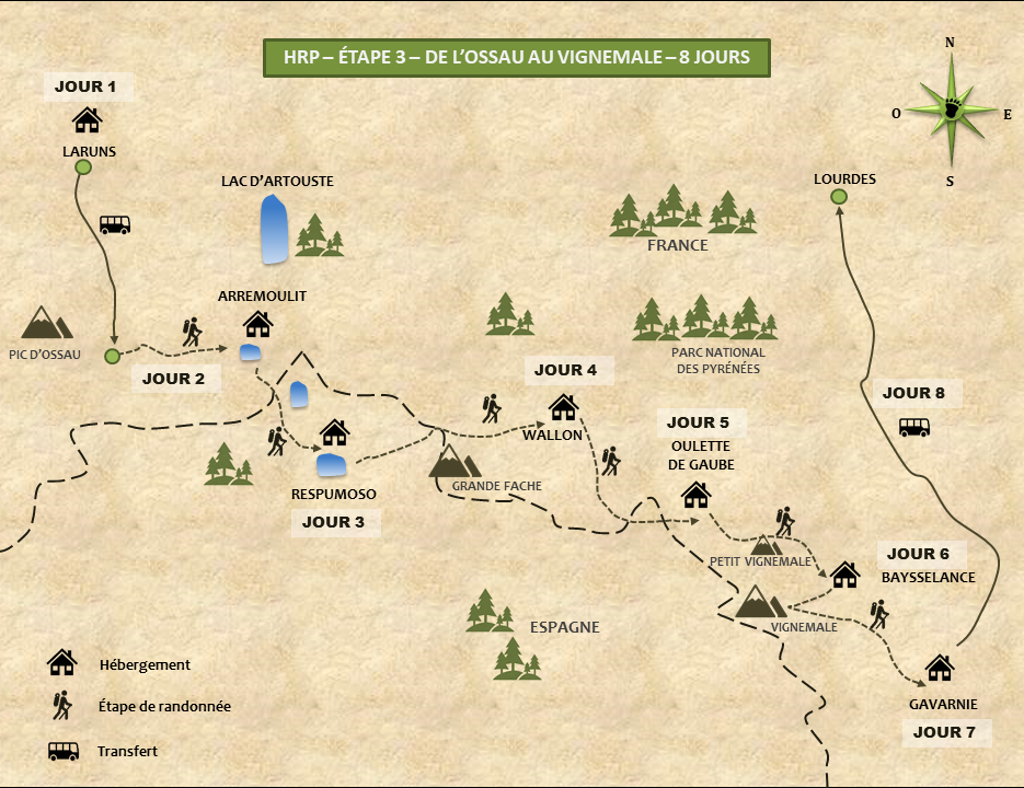 Étapes de 7h en moyenne, sur terrain difficile en montagne, sur éboulis, avoir un bon pied montagnard et surtout une bonne endurance.