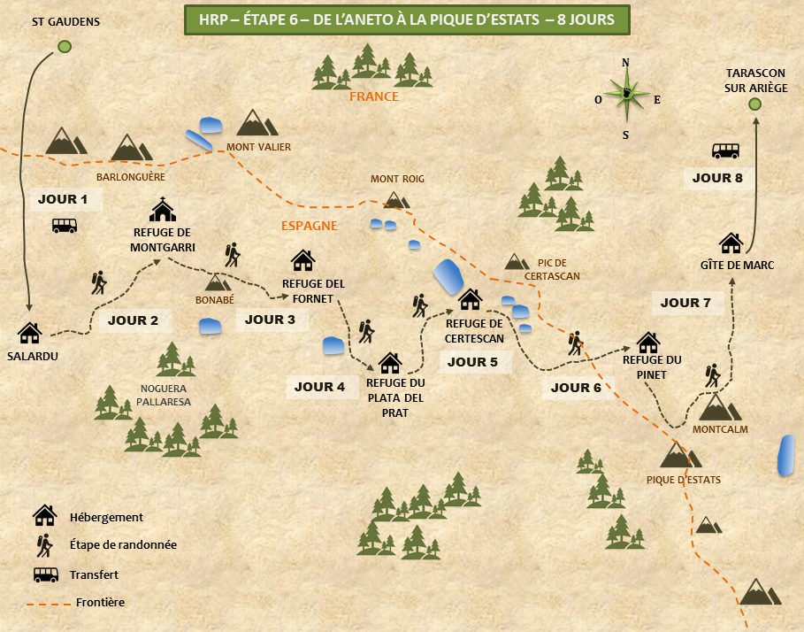 Cette magnifique étape traverse la Catalogne pour rejoindre la Haute Ariège. Au programme, l’ascension de trois sommets remarquables : le Mont Rouch (2 863 m), nommé d’après la couleur unique de ses roches, le Tuc de Certascan (2 853 m), et la Pique d’Estats (3 143 m), le plus haut sommet de l’Ariège et de la Catalogne.