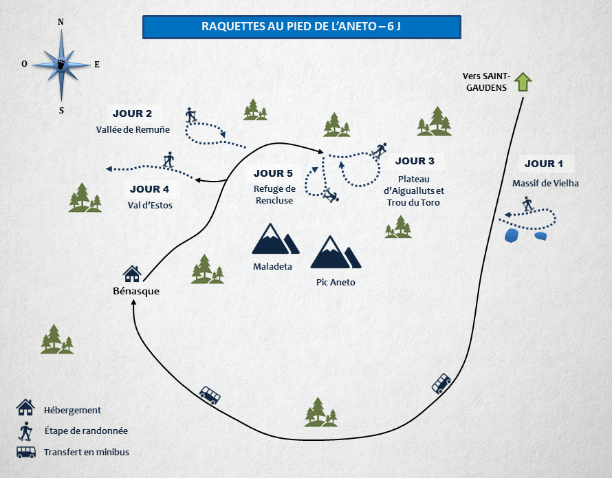 Nous irons découvrir un immense plateau, au pied du plus haut sommet des Pyrénées, l’Aneto. Une randonnée idéale pour la raquette à neige avec son doux profil, dans des paysages variés, petites forêts éparses de pins, bosquets et vallon largement ouvert et enneigé, sous les plus hauts sommets…