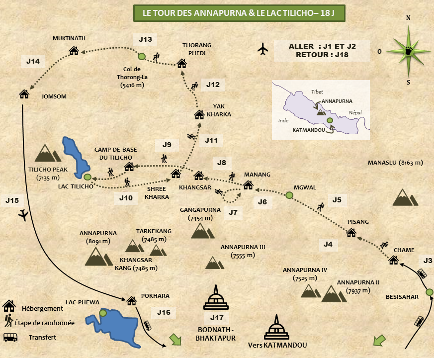 Passage du col Tilicho, le long des temples bouddhistes et des gompas… Par beau temps, la vue est magnifique sur la vallée de Khangsar, le Manaslu (8 163 m), le Khangsar Kang (7485 m), le Tarkekang (7202 m) et l’Annapurna I (8 091 m) descente ensuite vers le camp de base du Tilicho…